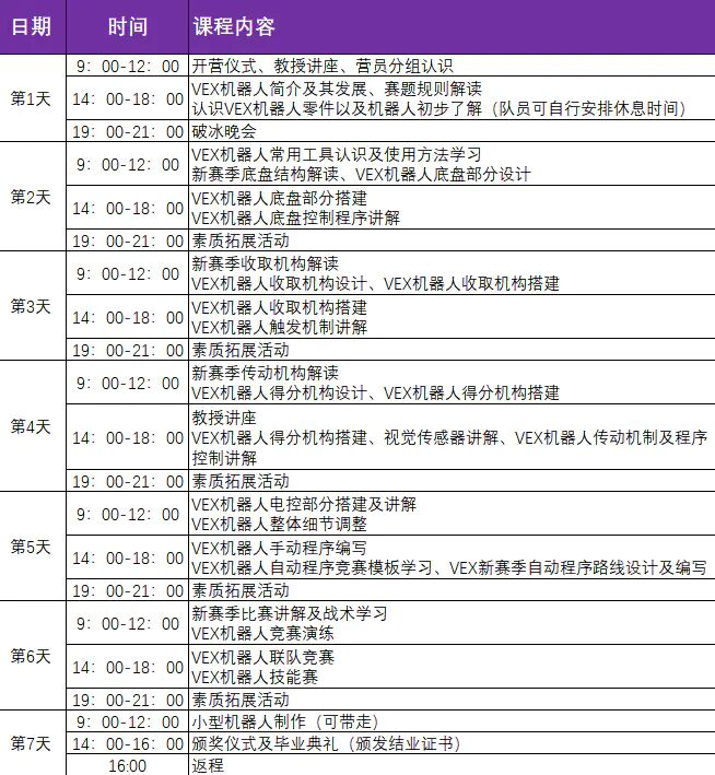 本次夏令营欢迎综合学业成绩优秀、且有志于机器人相关领域、学有余力的8~18岁学生参加,有搭建基础和编程基础的学生年龄可以适当放宽,在相关竞赛中取得优异成绩或拥有科创和发明成果的学生优先。参营学生规模计划30人。
