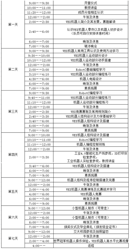 为增进全国中小学生对VEX机器人世界竞标赛的了解,深入体验西安交大的跨学科、跨领域的教育特色,让学生近距离感受VEX冠军团队氛围,激发兴趣、提高创新意识和实践能力,西安交大拟面向全国的优秀中小学生举办“2019-2020赛季VEX夏令营”。
