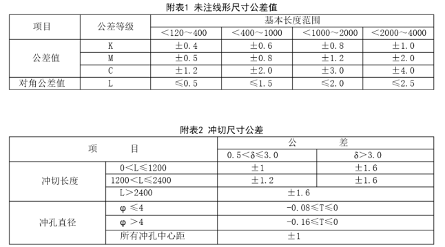 孔口无毛刺、凹凸不平、拉断、变形现象。孔位置尺寸在图纸或《未注线性尺寸公差值》规定公差范围内,见附表2