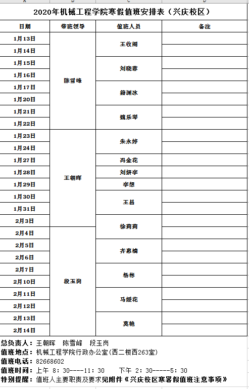 2020年金沙检测线路js69寒假值班安排表(兴庆校区)