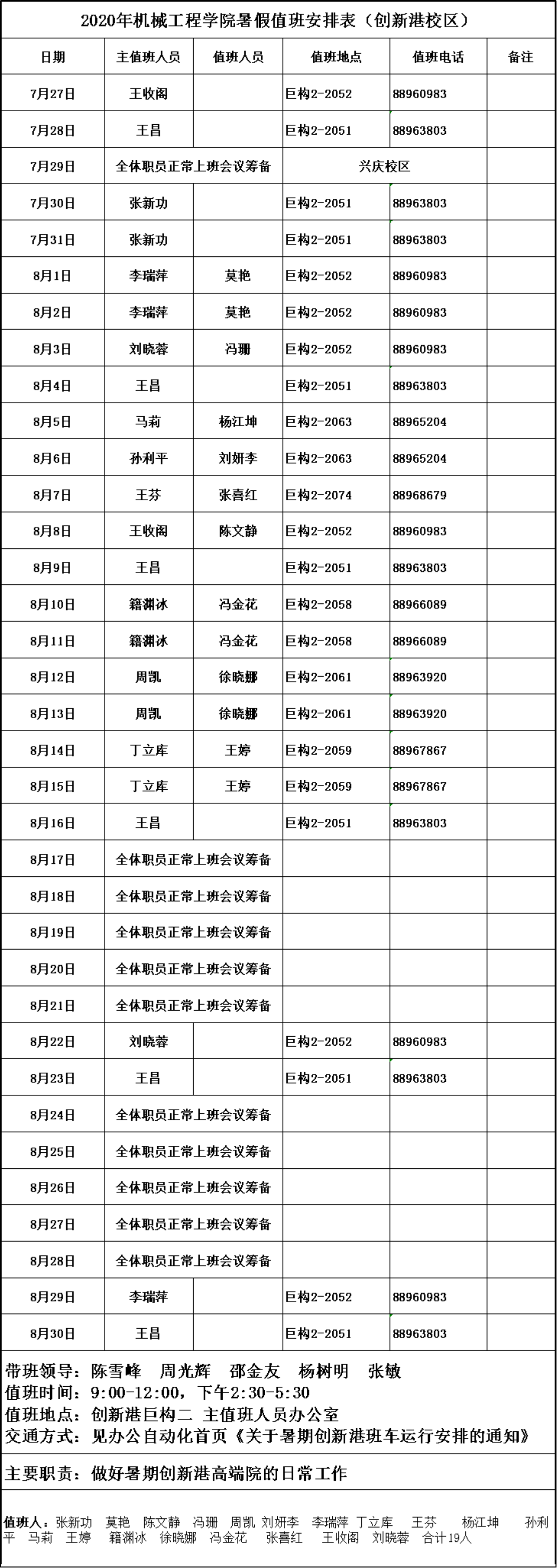 2020年金沙检测线路js69暑假值班安排表(创新港校区)