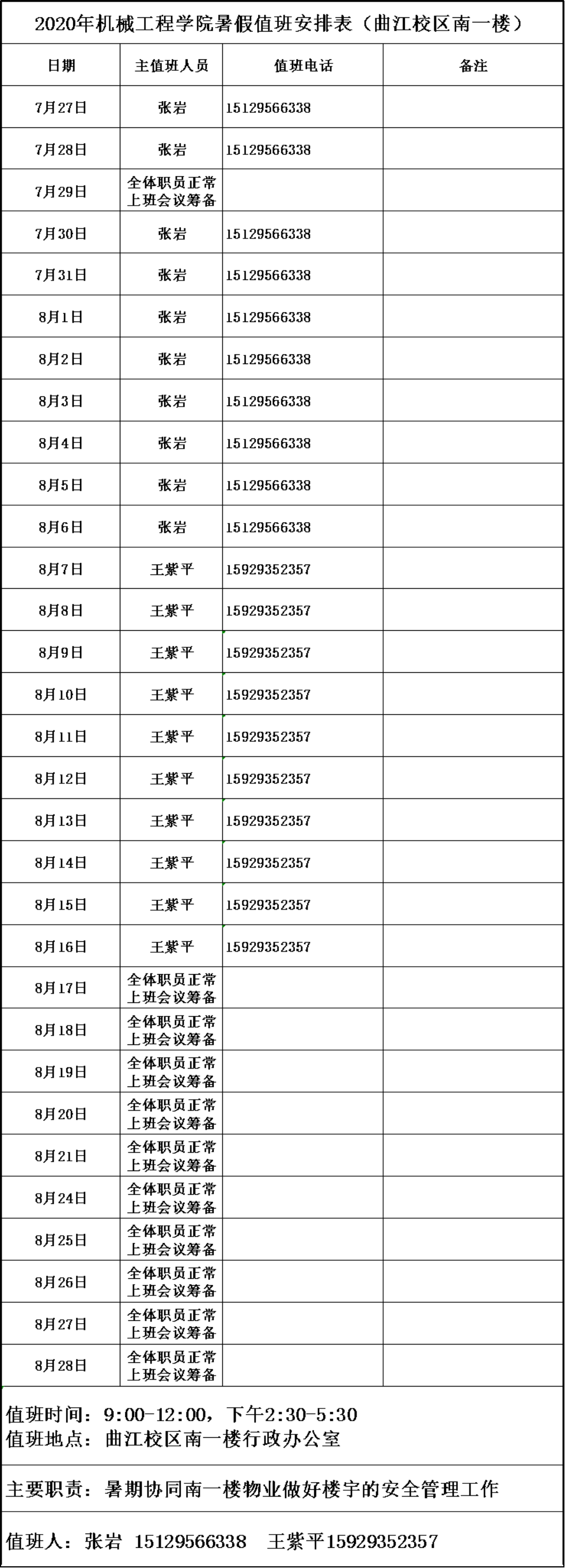 2020年金沙检测线路js69暑假值班安排表(曲江校区南一楼)